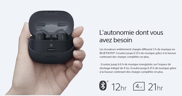 重さは約7.3g×2コと軽量設計になっています。Bluetooth 4.0をサポートし、コーデックはSBCとAAC。AACをサポートすることでiPhoneでも高音質を楽しめます。スマホとの接続時のバッテリー駆動時間は約3時間で、ケースで充電しながら使うことで12時間となります。本体に内蔵された音楽を聴く際は約6時間で、ケースで充電しながら使うことで21時間となります。