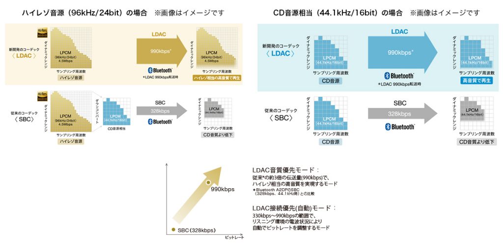 スマホとWALKMANの接続は、Bluetoothのオーディオコーデック(LDAC/AAC/SBC)で接続します。常に楽曲を転送しながら再生するため、多少のタイミングラグはでるとのことです。本機能利用時は、Bluetoothヘッドホン・イヤホンで聴くことができないので、必ず3.5mmのイヤホンジャックを接続して聴く必要があります。