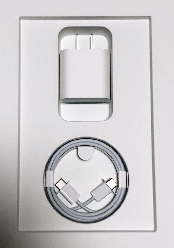 iPad Pro 11本体を持ち上げると、USB充電器とUSB Type-Cケーブルが付属しています。USB Type-Cケーブルは両方の先端がUSB Type-C端子のため、USB Type-C非対応のMac・Windows端末で使う場合は別途ケーブルを購入する必要があります。