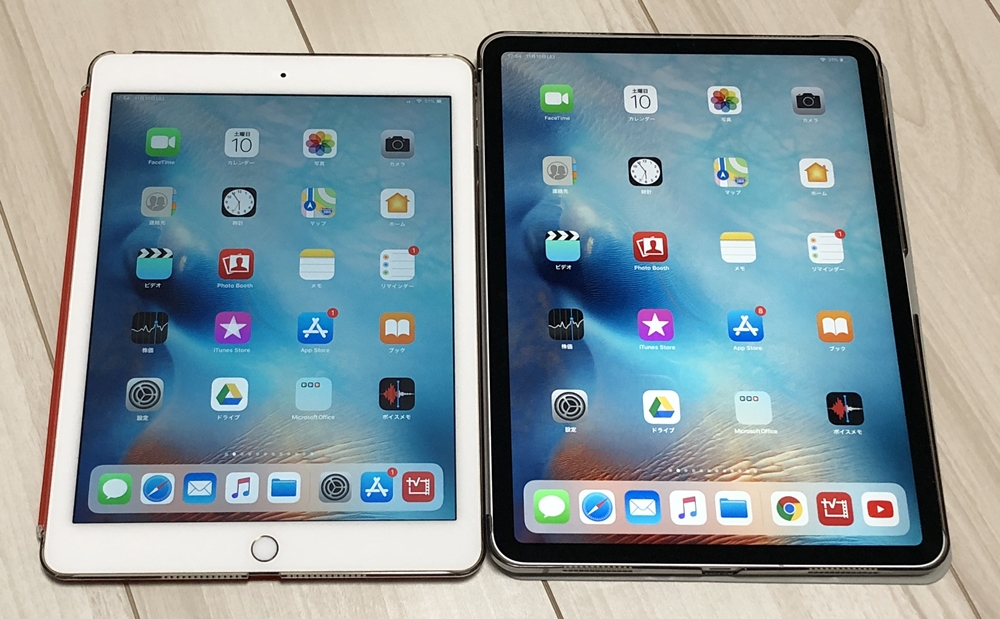 初期設定を終え、iPad Pro 11を使ってみました。iPad Pro 11以前は、iPad Air2を約3年ほど使っていました。iPad Air2 と iPad Pro 11を比較すると、右側のiPad Pro 11の方が一回り大きいのがわかります。iPad Air2の重さ444g、iPad Pro 11の重さが468gと重さはあまり変わりません。実際に両モデルを持ってみても、重さは気になりませんでした。むしろ、iPad Pro 11の方が画面が大きいという先入観により、軽く感じました。