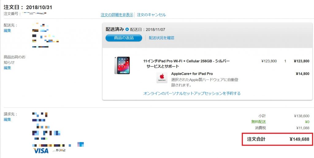 2018年10月31日、つまり発表直後に「iPad Pro 11 Wi-Fi + Cellular 256GB」をアップルオンラインサイトで購入しました。価格は\123,800(税抜)でした。。。お高いない。