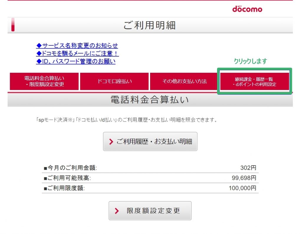 画面右側の「継続課金・履歴一覧・dポイントの利用設定」をクリックします。