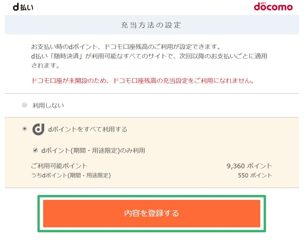 ③「dポイントをすべて利用する」をクリックし、「内容登録する」をクリックします。「dポイント(期間・用途限定)のみ利用」をクリックすると、期間・用途限定ポイントのみ使うことになり、残りの残金は携帯電話代金と一緒に請求されます。以上で、設定は完了です。このステップ2を完了させなければ、単なるd払いになるため注意が必要です!