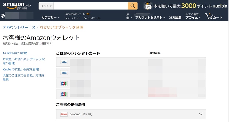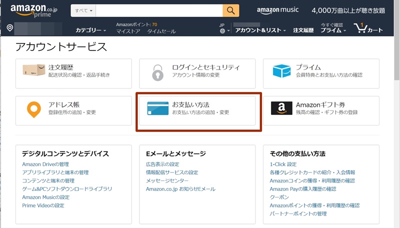 ①Amazon.co.jpの「アカウントサービス」→「お支払い方法」をクリックします。