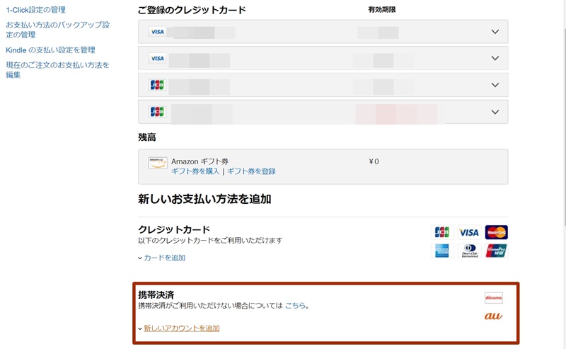 ②携帯決済の「新しいアカウント追加」をクリックします。