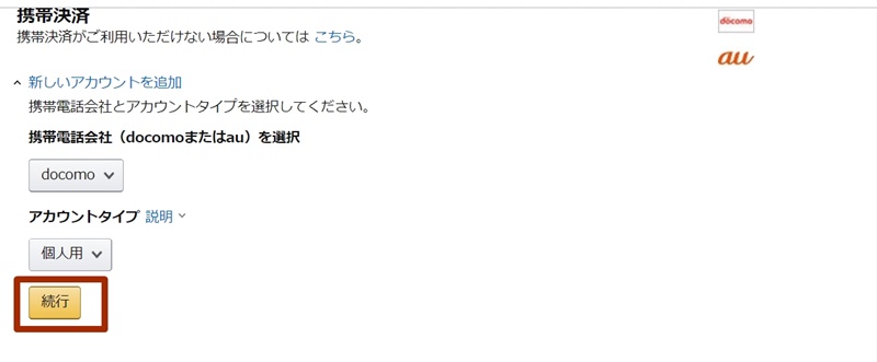 ⑥Amazon.co.jpの画面に戻り、ご登録の携帯決済が「docomo」になっていれば、ステップ1は完了です。これで、Amazon.co.jpでの決済を「d払い」で行うことができます。
