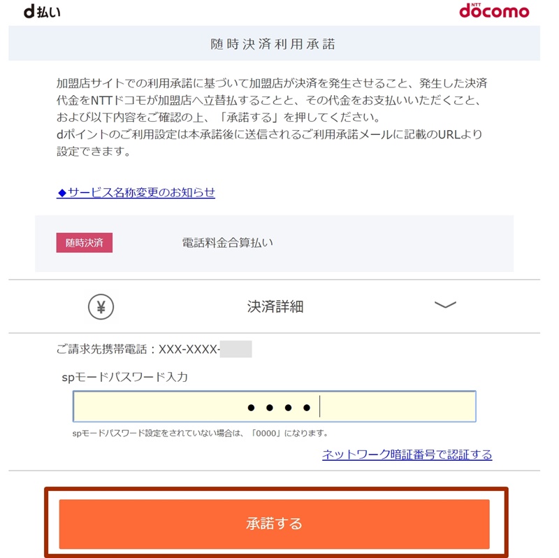 ④SPモードパスワードを入力し、「承諾する」をクリックします。