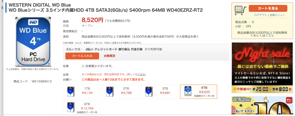 新たに自宅用のNASを購入しようと価格.comをポチポチ眺めていたところ、NTT-X Storeにてウェスタンデジタル WD Blue 4TB「WD40EZRZ-RT2」が7,980円(税込)で販売されていたので、購入しました。