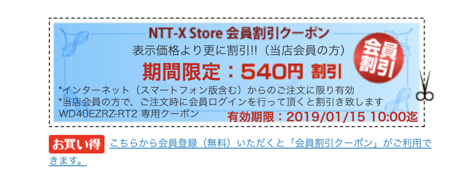 よって、WD40EZRZ-RT2(4TB)を2台購入すると、1,028円(セール価格)+1,586円(dポイント)=合計 2,624円もお買い得に購入することができます。