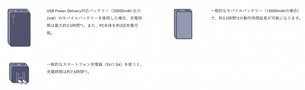 スマホ用の5VモバイルバッテリーでもVAIO SX14を充電できる機能を搭載しています。5V/1.5Aでのフル充電も実現しており、0%から100%まで約7.5時間で充電ができます。VAIO SX14の充電器を忘れた際も、スマホモバイルバッテリーで代用できるため、ビジネスシーンでも役に立ちます。