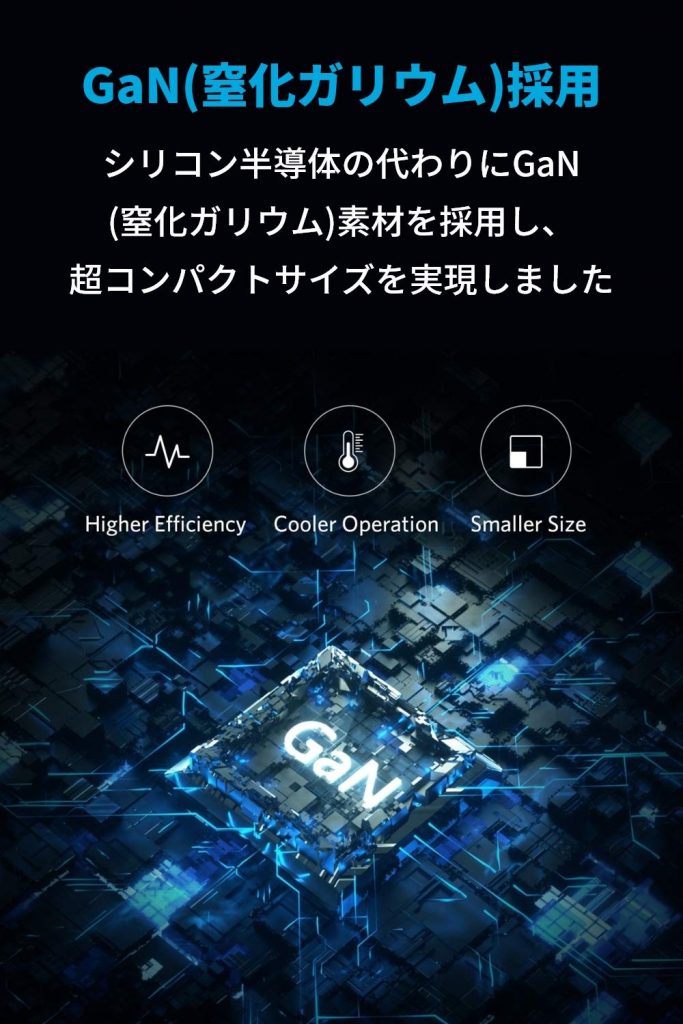 一般的な充電器の内部パーツにはシリコン半導体が使われていますが、3モデルと共にGaN(窒化ガリウム)素材を採用したことにより大幅な小型化を実現。コンパクトなサイズでありながら、高出力で充電できるので短時間でスマホやノートPCの充電が可能となりました。