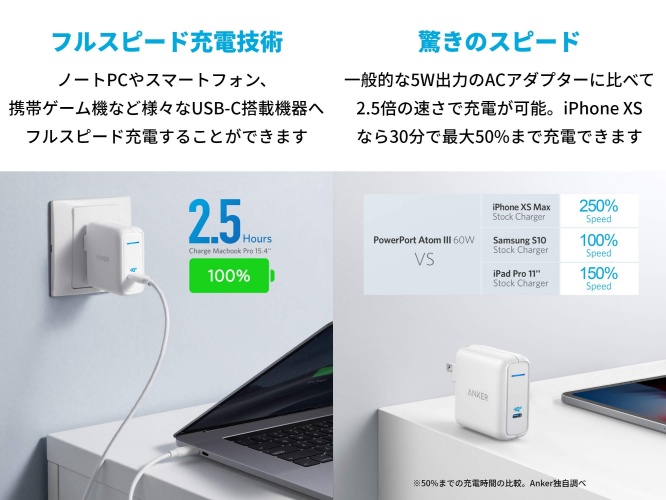 製品名の通り、最大出力は60WでMacbook Pro 15であれば2.5時間でフル充電できます。iPhone XSであれば30分で50%充電が可能です!もう一度言いますが、コンセント部分は折り畳みが可能です!