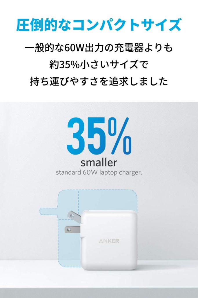 一般的なノートPCの60W純正充電器より35%小さいサイズとなります。この35%という数値は恐らくMacbook Pro 13に付属している充電器のことを指していると考えられます。