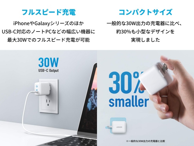 一般的なノートPCやタブレットの30W純正充電器より30%小さいサイズとなります。