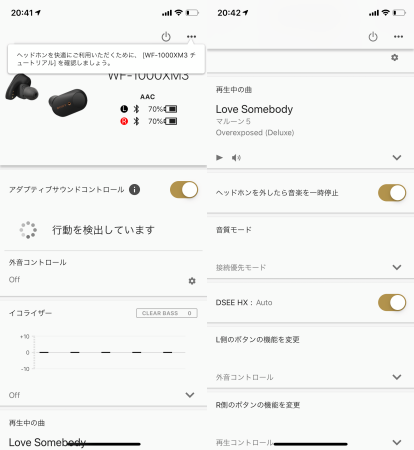 LDACコーデックは非対応ですが、DSEE HXを搭載したことにより、SpotifyやMP3などの音源を「ハイレゾ音源相当」にアップコンバートでき、高音質な楽曲を楽しめます。