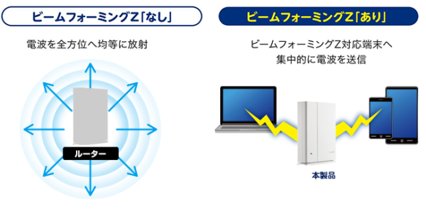 ビームフォーミングは電波の飛び方を制御する機能です。従来のWi-Fiでは、電波は上下左右の全方向に放射線状に放射されますが、ビームフォーミングでは「ビームフォーミング対応デバイス」に向けて電波が放射されます。