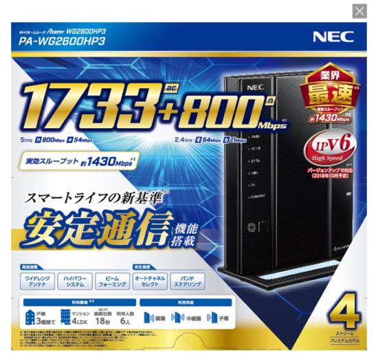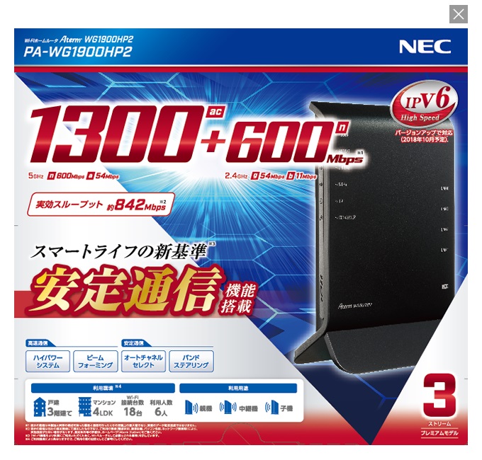 NECプラットフォームズ製の「Aterm WG1900HP2」です。IEEE 802.11 b/g/n/a/ac(2.4GHz/5GHz)サポートし、最大速度は 1300Mbps(5GHz) / 600Mbps(2.4GHz) となっており、ミッドレンジモデルになります。。有線LANは1Gbps、IPv6(IPoE)に対応しており、フレッツ光やドコモ光などでもサクサク動作します。コストパフォーマンスに優れており、1Kから2LDKまでの家にオススメです。