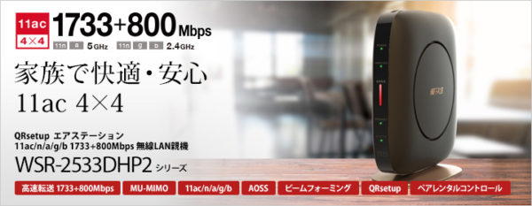 エレコム製の「WRC-2533GST2」です。老舗アンテナメーカーのDXアンテナが監修したハイパワー内蔵アンテナを搭載し、従来品と比べてWi-Fiの飛距離や安定性が大幅に向上しています。IEEE 802.11 b/g/n/a/acをサポートし、ac規格の最大速度は1733Mbpsとなっています。