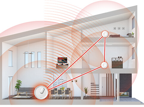 一戸建てや3LDK以上のマンションなどでは、1台ハイパワーWi-Fiで全ての部屋でWi-Fiを使用できるようにするのが従来のやり方でした。しかし、3階建ての一戸建てなどを1台でカバーするのは物理的に限界があります。そこで登場したのが『メッシュネットワーク』というメソッドに基づいた「メッシュWi-Fi」です。