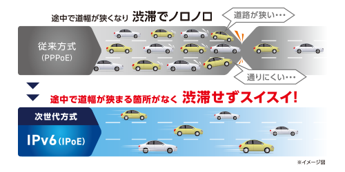 これを解決するのが「IPv6(IPoE)」接続です。ドコモ光などを「IPv6(IPoE)」で接続すると、夕方や夜間などの混雑ピークタイムでも日中と変わらない高速通信が可能です。IPv6(IPoE)接続にするには、IPv6(IPoE)対応Wi-Fiとドコモ光やコラボ光への別途申し込み(無料が多い)が必要です。特にドコモ光ユーザーには必須サービスとなります。