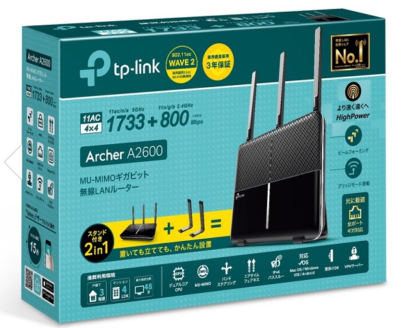 TP-Link製の「Archer AC2600」です。日本では聞きなれないメーカーですが、無線LAN(Wi-Fi)のグローバルシェアは45%と非常に高いメーカーです。コストパフォーマンスに優れ、細かな設定もできることから日本でもシェアが上がりつつあるメーカーです。
