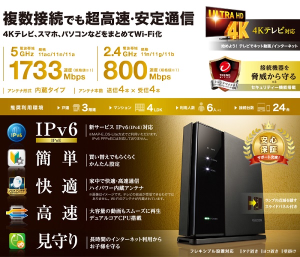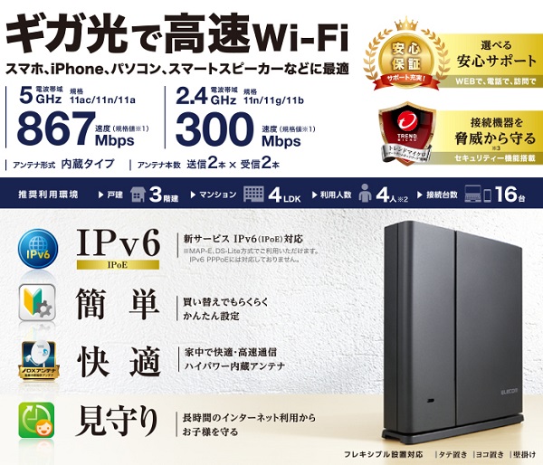 エレコム製の「WRC-1167GST2」です。老舗アンテナメーカーのDXアンテナが監修したハイパワー内蔵アンテナを搭載し、従来品と比べてWi-Fiの飛距離や安定性が大幅に向上しています。IEEE 802.11 b/g/n/a/acをサポートし、ac規格の最大速度は867Mbpsでミッドレンジモデルとなります。