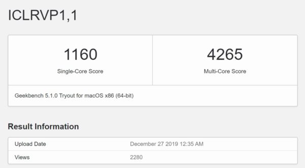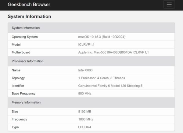 今回登録されたデータによると、マザーボードに「Apple Inc.」の文字列が含まれており、モデル名は「ICLRVP1,1」、OSは「macOS 10.15.3(Build19D2024)」となっています。