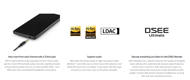 ミュージック関連機能も強化されています。前モデルのXperia 1では廃止されていた「3.5mmイヤホンジャック」が復活しました。これにより有線イヤホンを変換アダプタ無しで利用できます。