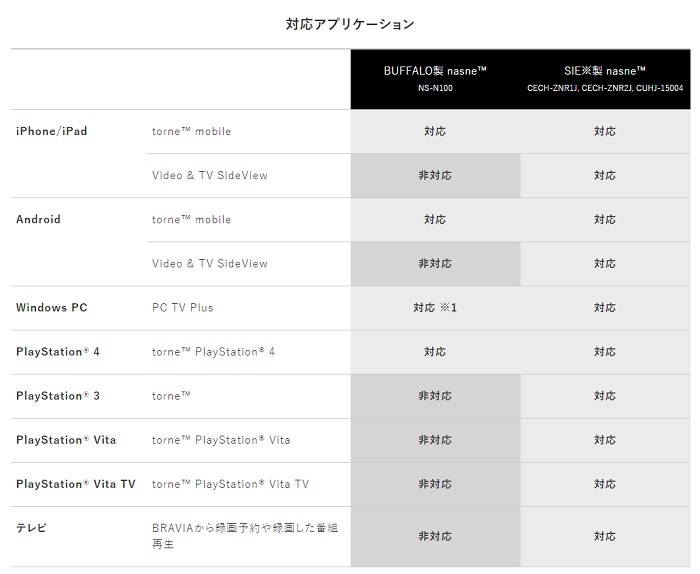 ただし、BUFFALO製nasneではソニー純正テレビ視聴・録画アプリ Video&TV SideViewが非対応となります。スマホでテレビ視聴・録画再生をする場合は必ず「torne mobile」が必要となる点には注意が必要です。