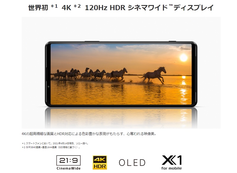 前モデルに引き続き、6.5インチ 4K 有機EL 21:9 シネマワイドディスプレイを採用。Xperia 1 IIIからは新たに世界初となる「4K 120Hz HDR」の有機ELディスプレイとなり、より滑らかな映像が楽しめるように進化しました。BRAVIAにも採用されている「X1 for mobile」、コンテンツ制作者の意図した画作りを実現する「Creator mode」も引き続き搭載。出荷時に個体差が出ないよう1台毎にキャリブレーションを実施しており、個体によっては白っぽく見える、黄色っぽく見えるなどの発色差を無くしています。