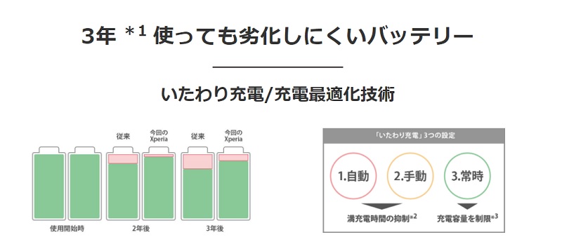 バッテリーの負荷を低減する「いたわり充電」とXperia独自の「充電最適化技術」により3年使っても劣化しにくいバッテリーとなっています。昔は2年サイクルでスマートフォンを買い替えるユーザーがほとんどでしたが、現在は3年程度使い続けるユーザーも多いためヘタリにくいバッテリーなのは非常に嬉しいですね。