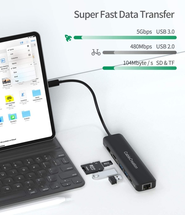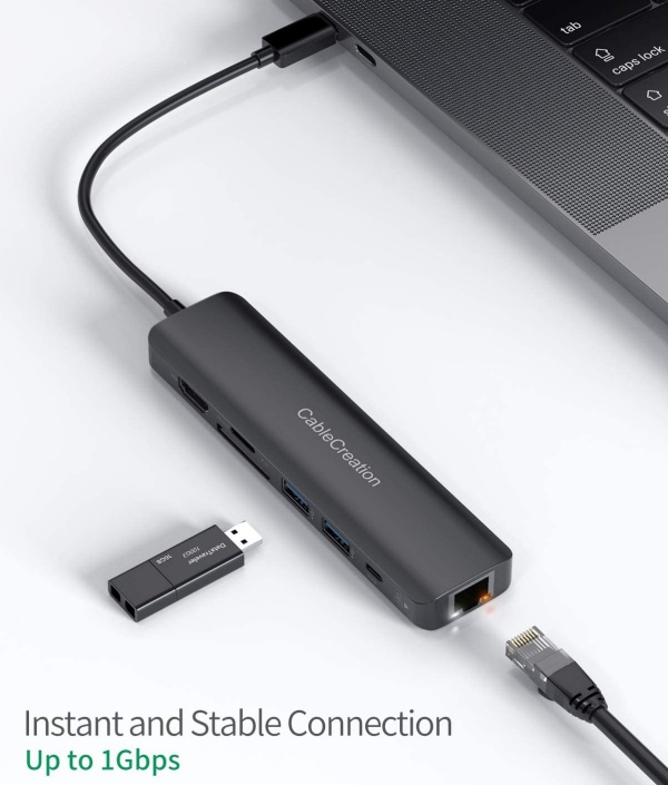 CableCreation 7in1は、PD充電、HDMI(4K@60Hz)、ギガイーサネット・SD/microSDカードリーダー・USB 3.0を1本のケーブルでカバーできるオールインワンのUSB Type-Cハブとです。