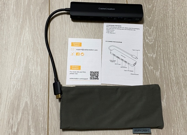 パッケージを開封すると、CableCreation 7in1 に加えて、トラベルポーチ、各種マニュアルが同梱されています。